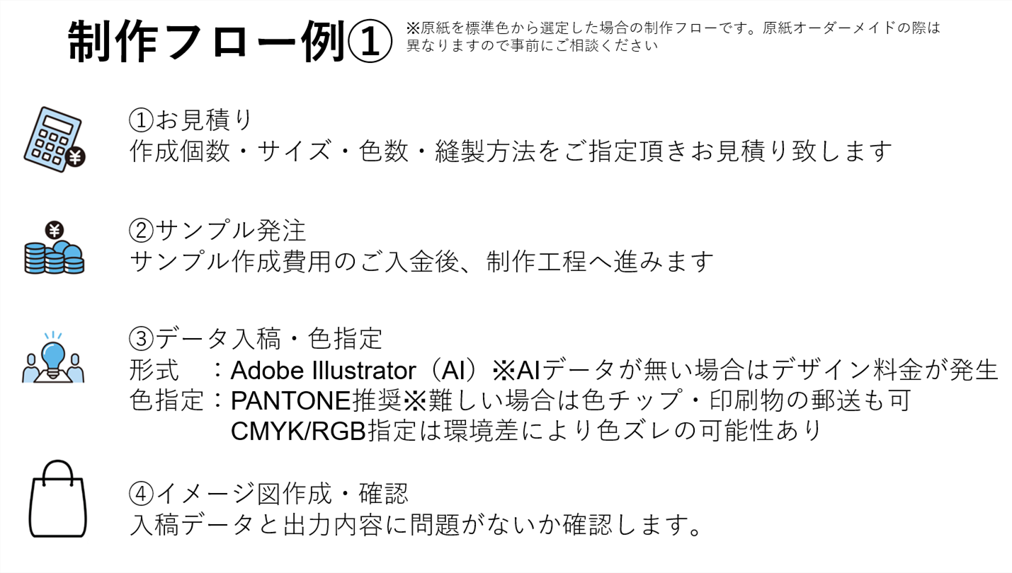 ◆受注生産が可能で、原紙の色や厚み・加工タイプ・縫製方法・印刷デザインを細かくご指定いただけます